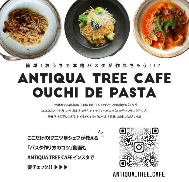 「OUCHI DE PASTA」では、元三ツ星シェフが作る「ANTIQUA TREE CAFE特製 冷凍パスタソース(国産牛たっぷりのミートソース、にんにく香る博多辛子明太子ソース、じっくりコトコト煮込んだトマトソースの3種類)」や「糖質80%OFF ローカーボパスタ」の冷凍パックが24時間いつでもお買い求め可能。ご自宅での簡単調理で、元三ツ星シェフによる本格的な絶品パスタ料理がお楽しみいただけます。