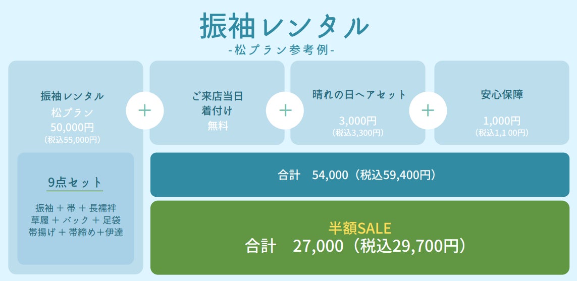 内容 :2022年成人式に参加される新成人の方が開催期間内に店頭・宅配にて振袖レンタルをご予約でお支払額から半額となります。