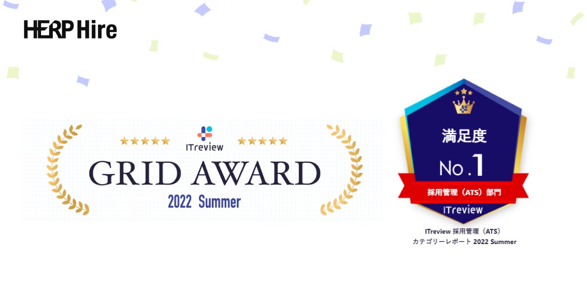 この度『HERP Hire』は「ITreviewカテゴリーレポート2022 Summer」の採用管理(ATS)部門において顧客満足度No.1を獲得し、「使いやすさ」「導入のしやすさ」のレーティングにおいてもNo.1を獲得しました。また、「ITreview Grid Award 2022 Summer」の同部門では5期連続となる「Leader」を受賞しています。