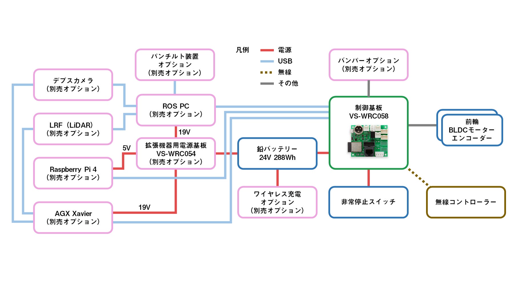 | 注文時オプション | レーザレンジファインダー バンパーオプション(前後、全周囲) 拡張機器用電源基板 VS-WRC054 Raspberry Pi 4B ワイヤレス充電 ROS PC / ROS PC(UM340) カメラステー デプスカメラ リモート制御 Jetson AGX Xavier™ パンチルト装置 |