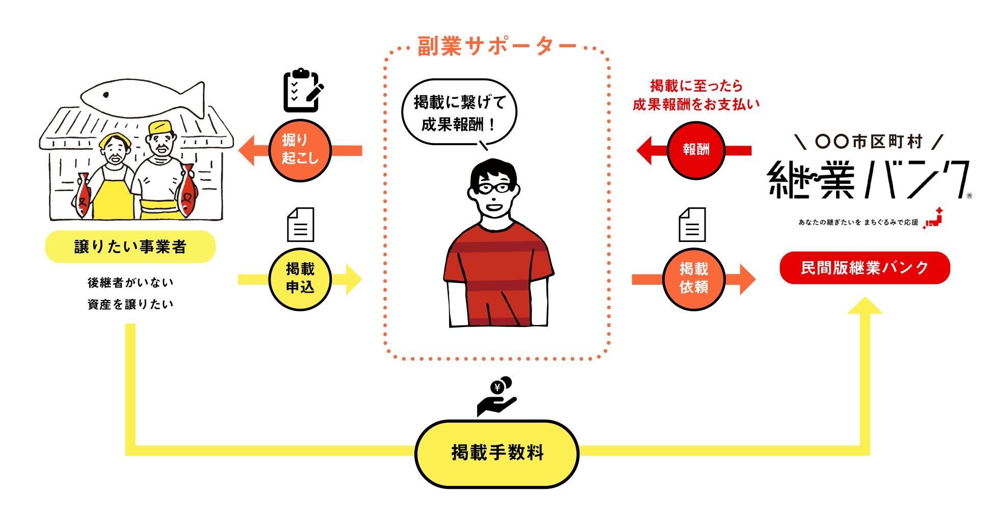 後継者不在で悩んでいる事業者を発掘し、掲載に至った場合に成果報酬を得られる仕組みです。