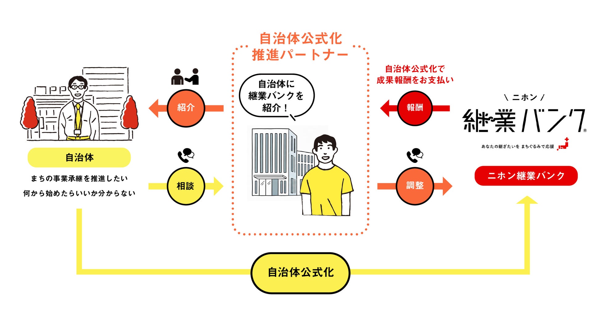 自治体への継業バンク導入を推進し、導入が決定した場合に成果報酬を得られる仕組みです。