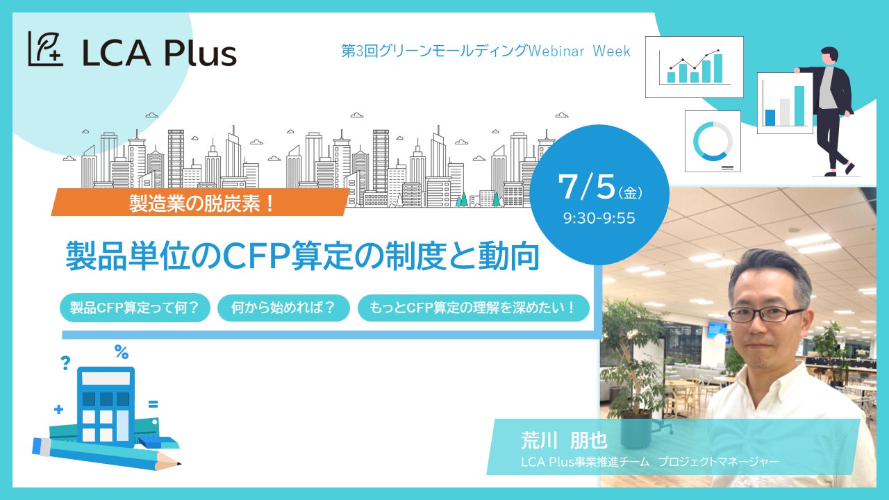 本ウェビナーではこれからCFP算定に取り組む企業、担当者の方向けにわかりやすくCFPの算定方法概要、動向をご説明。また、国内初の製品CFP算定に特化したプラットフォームであるLCA Plusをご紹介します。