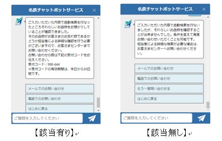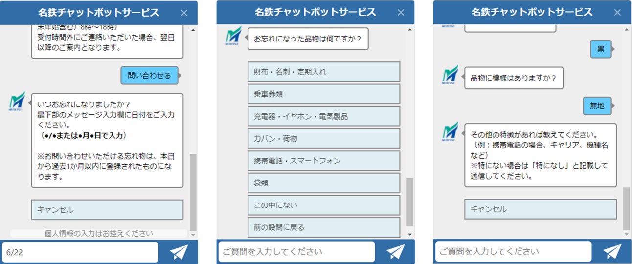 当社ホームページのチャットボットに、新たに遺失物に関する検索ができる機能を持たせ、お客さま自身でいつでも(24時間365日)、どこでも(スマートフォン・パソコンから)遺失物を探すことが可能となります。チャットボットが遺失物の特徴をヒアリングし、該当する遺失物が当社に保管されているかを確認できます。(該当有りとなった場合、「名鉄お客さまセンタ―」にご連絡いただき、最終確認を行います。)