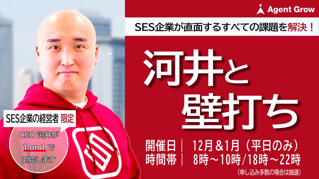 株式会社エージェントグロー(本社:東京都港区、代表取締役:河井智也)がSES企業経営者向けに限定開催する無料オンラインmeet upにつきまして、開催内容と日程が決定いたしました。