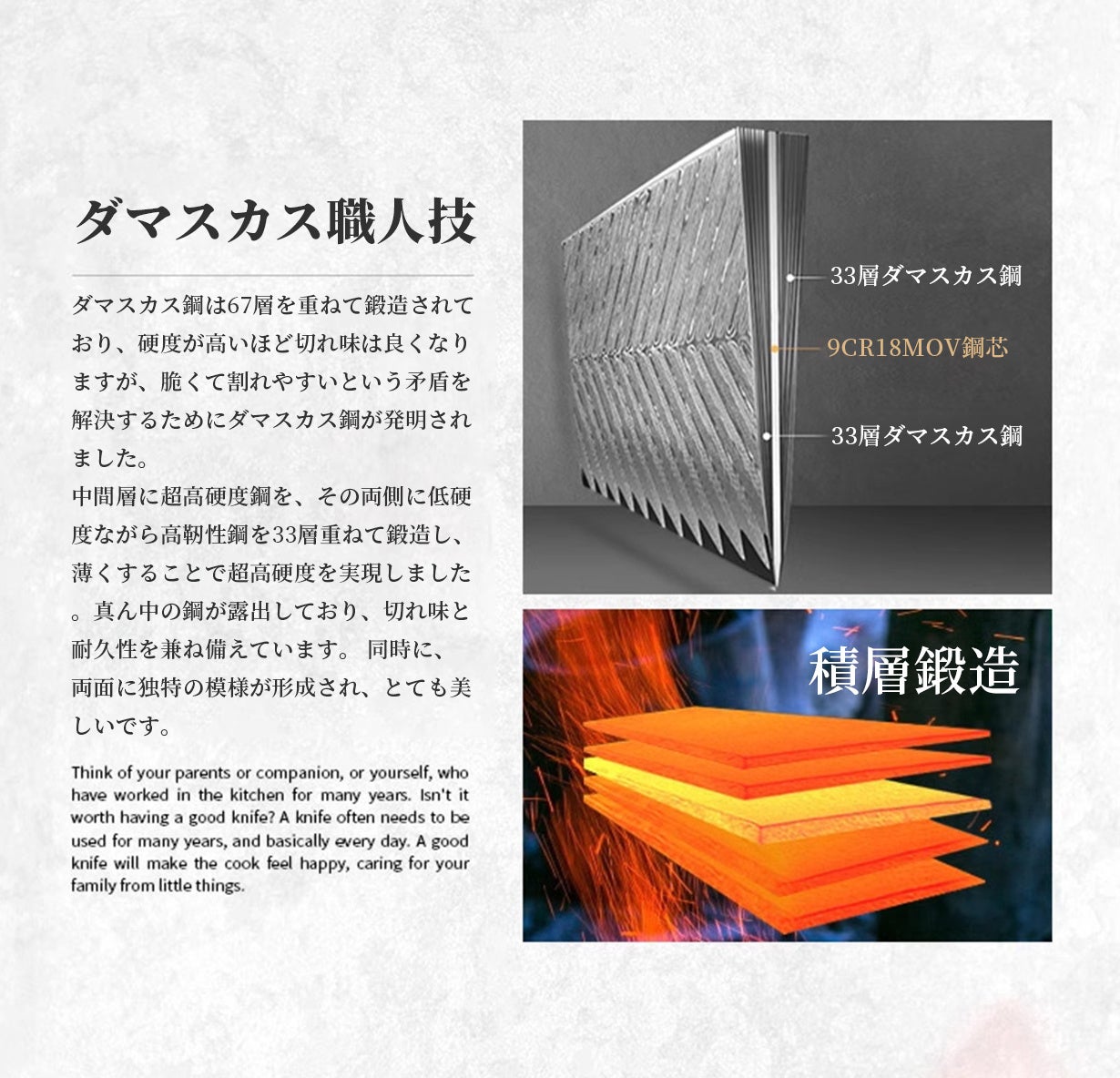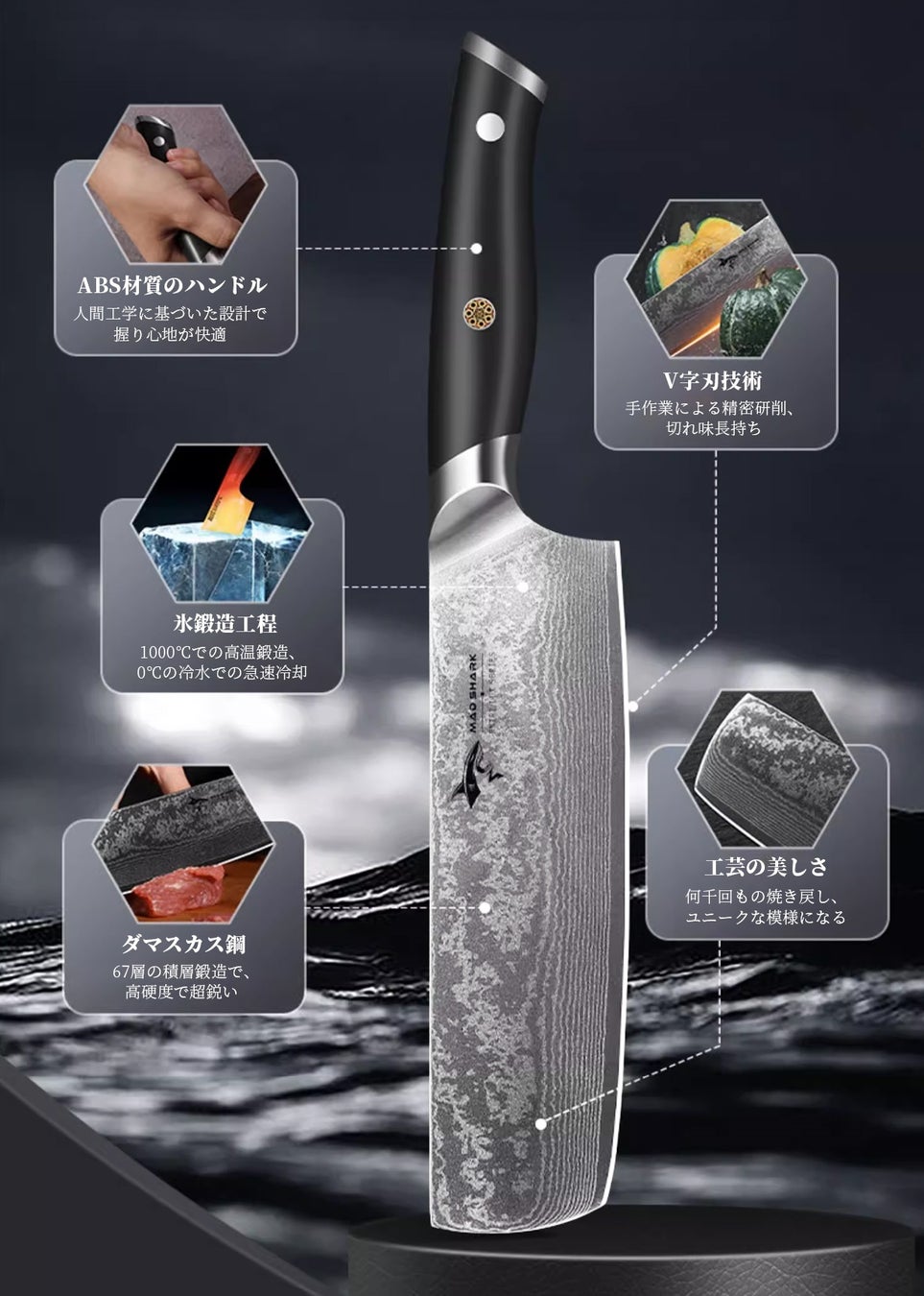 ダマスカス鋼の中心層には、ドイツ製の超高硬度モリブデンバナジウム鋼が使用されています。その両側には、各33層ずつ靭性が向上したダマスカス鋼を重ね、合わせて67層に積層鍛造されています。製造過程は非常に複雑でコストが高く、生産量にも制限がありますが、完成し包丁は卓越した切れ味と高い耐久性を備えています。