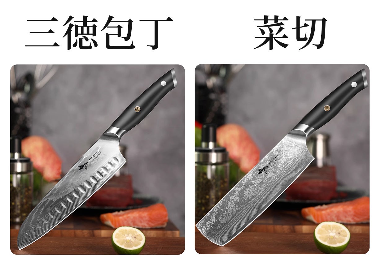 高品質で手頃な価格のダマスカス鋼包丁「 三徳包丁&菜切」、セットに砥石が景品! |