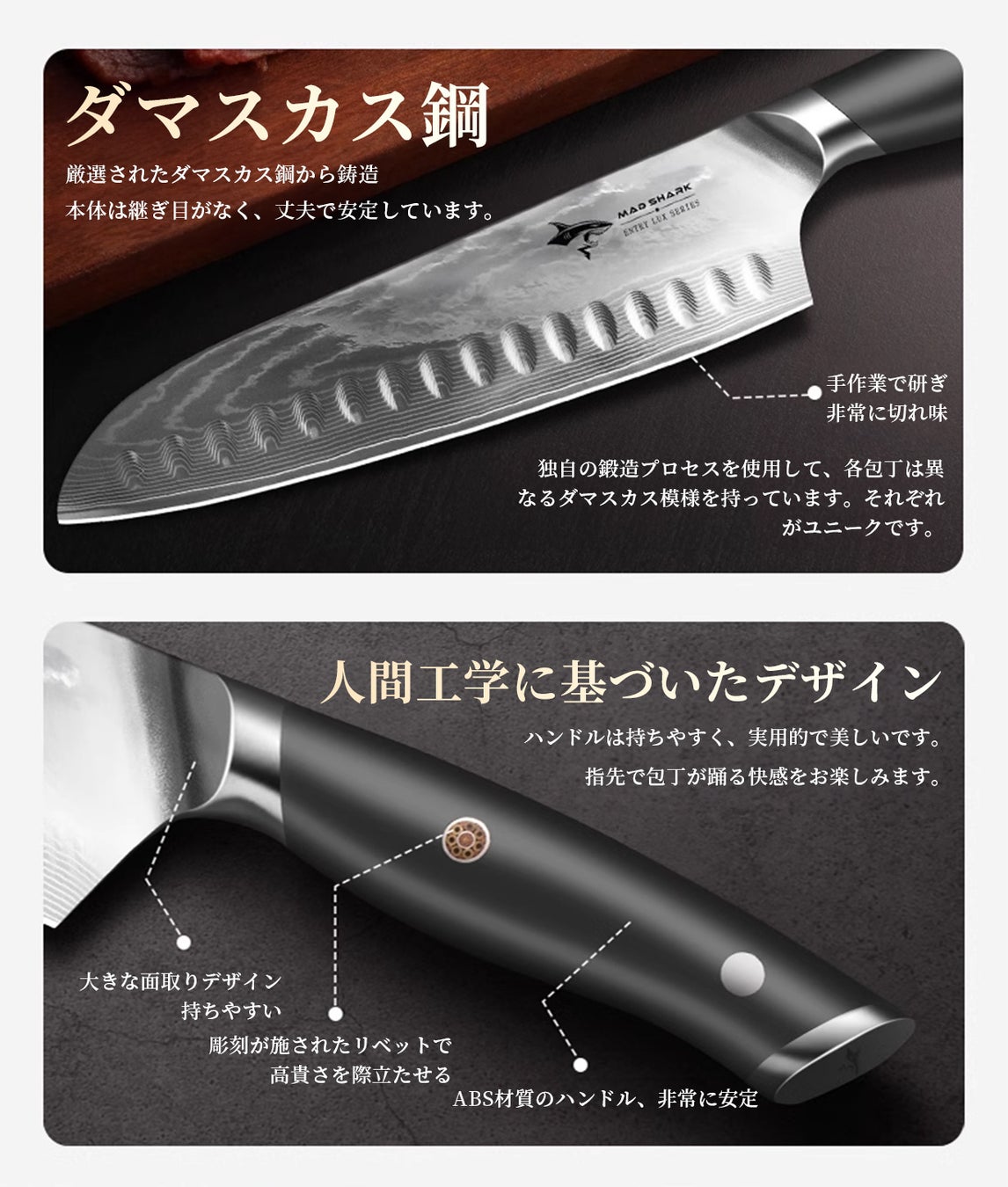 ①ブレードはドイツ産ダマスカス鋼を採用し、精密な鍛造技術で一本一本丁寧に作り上げられており、模様が美しくて独特で、それぞれの包丁がユニークです。