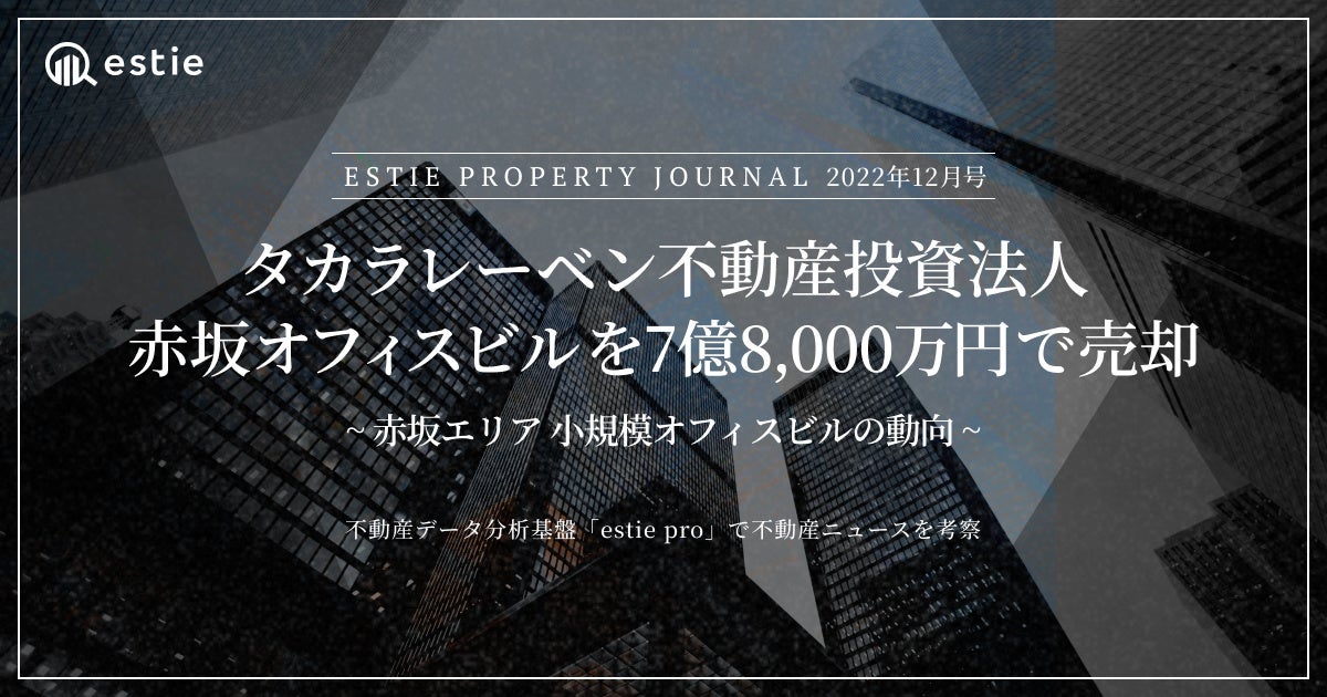 企業による価値創造の心臓部であるオフィスをはじめとする商業用不動産業界のデジタルシフトを推進し、日本最大級の商業用不動産データ分析基盤「estie pro」を提供する株式会社estie(本社:東京都港区、代表取締役CEO:平井瑛、以下「estie」)は、注目エリアの最新不動産ニュースを「estie pro」を用いて分析する「ESTIE PROPERTY JOURNAL」の2022年12月号を配信します。本号では、2022年12月16日にタカラレーベン不動産投資法人が発表した港区赤坂2丁目オフィスビル売却という情報を起点に、赤坂エリアにおける小規模オフィスビルの需給動向について調査しました。