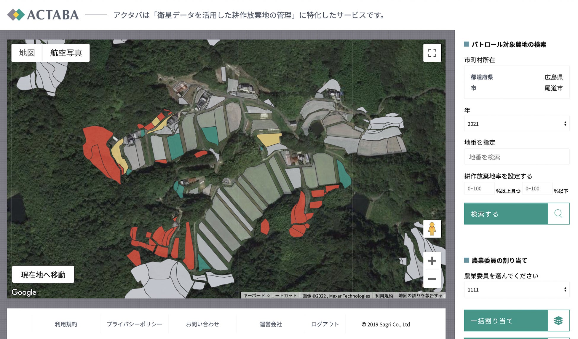 尾道市農業委員会事務局では、農地法に基づき、毎年、市内全域の農地の利用状況を目視により確認しています。毎年、8、9月の酷暑の中、紙の地図を持って農地を1筆ごとに確認して歩くのは、尾道市農業委員、農地利用最適化推進委員にとって、体力的にきつい側面や、時間がかかることが課題でした。こうした課題を解決するため、サグリ株式会社は、尾道市農業委員会へ衛星データによる農地パトロール調査を効率化するシステム“アクタバ”を提供。ドローンによる技術支援を行う大信産業株式会社とも連携をし、尾道市農業委員会が安全で効率的な農地パトロール調査を実現できる状況をサポートします。