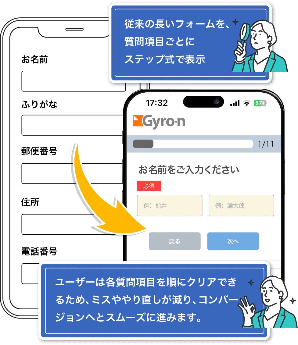 しかし、Gyro-n EFOネクストなら自動的に既存の入力フォームをステップ式フォームに変換、ユーザーは一問ずつ確実に回答できるようになるため、フォーム入力時のストレスが軽減されます。さらに、EFOの入力アシスト機能により、入力ミスの即時検出や入力補助が行われ、ユーザーの入力体験が大幅に向上します。とりわけ、スマートフォンのフォームや、年配層を対象とするフォームの利便性を高めるため効果が期待できます。