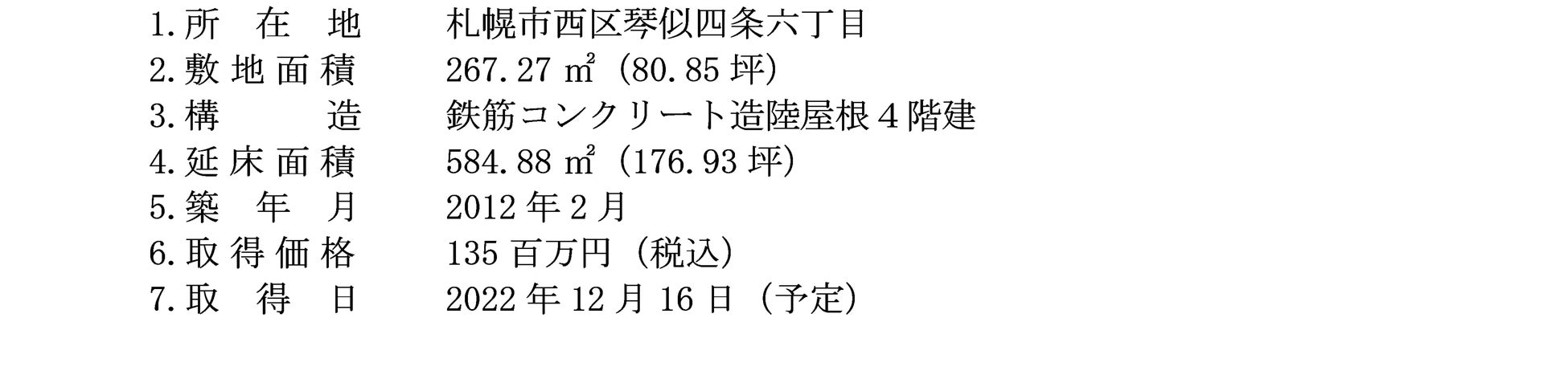 今般、10億円の家賃収入売上達成に向けて、2022年11月24日付で売主と売買契約を締結し、2022年12月16日(予定)付で、札幌市西区の賃貸マンション「K-MODE琴似」を取得することを決定いたしましたので、お知らせいたします。