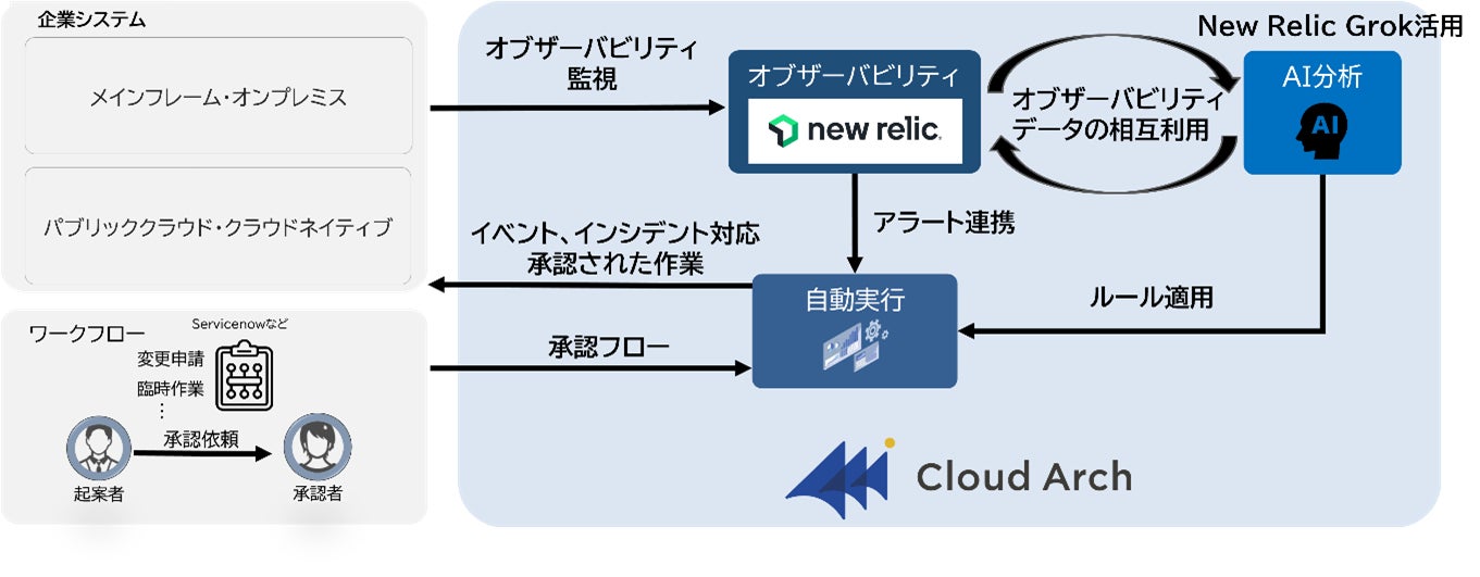 そこで、オージス総研では大阪ガス向けの運用実績を活かし、業界共通の課題に応えるため「AWS監査サービス powered by オブザーバビリティ」の提供を開始します。「Cloud Arch」に、New Relicによる設定情報監査とダッシュボード機能が加わることで、異変の検知やセキュリティルール準拠状況が全社横断で確認しやすくなるとともに、お客様独自のセキュリティルールにも柔軟に対応しながら、システムのクラウド化を支えるものとなります。また、「AWS監査サービス powered by オブザーバビリティ」で検知したイベントのアラート通知にAI機能を連動させることで、運用エキスパートと同等のレコメンドを提供する機能も提供予定です。