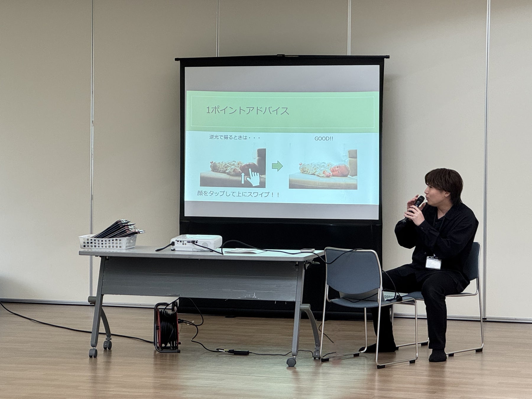 今年度は、本講座として初めて、育児休業を取得した男性社員が講師を担当しました。プロカメラマンとしての視点に加え、自身の育児経験を踏まえながら、お子さんを撮影する際のポイントを解説。参加者それぞれのスマートフォンを使用した実践的な撮影練習も行い、日常ですぐに生かせる内容となりました。