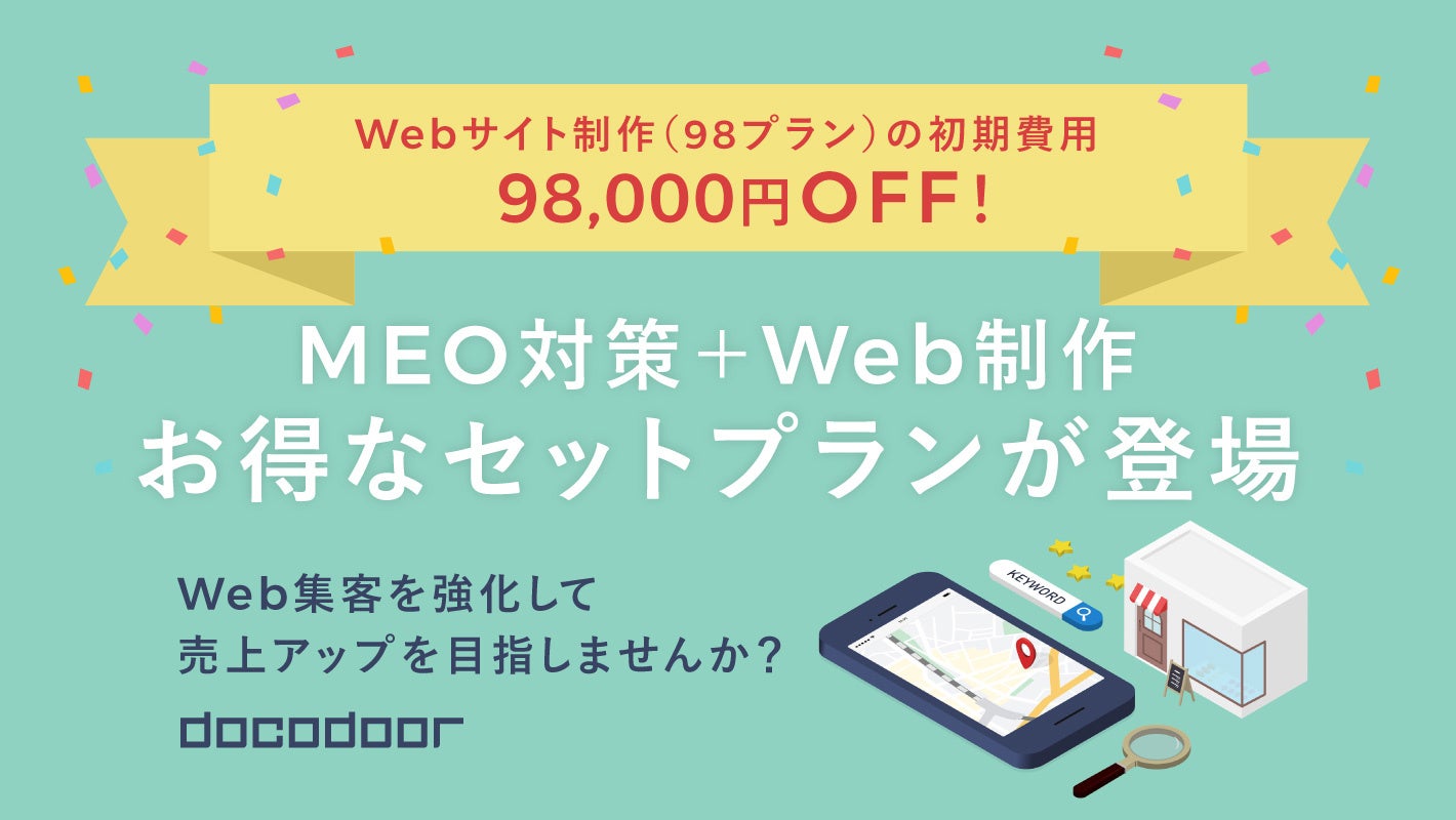 ドコドア株式会社(本社:新潟県三条市 代表取締役:本間隆之)は、Webサイト制作「98プラン」とMEO対策「ドコドアMEO」のセットプランを特別価格で提供いたします。