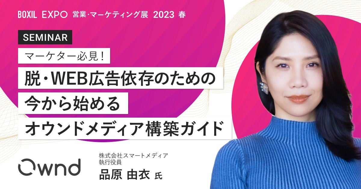 オウンドメディア事業を展開する株式会社スマートメディア(本社: 東京都港区、代表取締役社長:成井 五久実)は、3月28日 (火) ~ 3月30日 (木) に開催される「BOXIL EXPO 営業・マーケティング展 2023 春」にて、無料オンラインセミナー「マーケター必見! 脱・WEB広告依存のための今から始めるオウンドメディア構築ガイド」に登壇します。本セミナーでは、WEB広告に頼らず効果的な集客につながる企業のオウンドメディア施策について、成功事例とともにご紹介します。