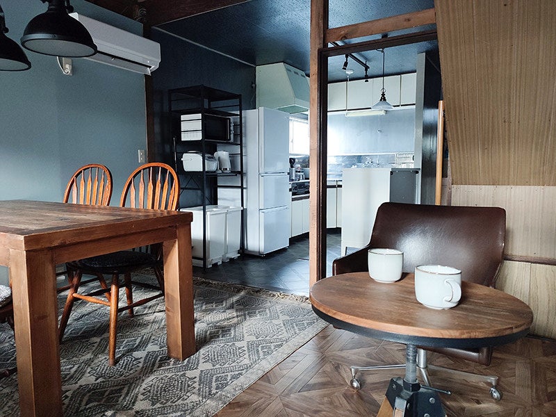 そこで、シャッター部分に木製建具を取り付け、既存の土間の上に床をつくることで、広々とした共有部につくりかえました。キッチンとの段差も解消されたので使いやすさも向上しています。元々の雰囲気を残すために、天井材を撤去してあえて梁を見せたり、一部の壁は塗装せずにそのままにすることで、かつての面影を残すようにしました。加えてインダストリアルテイストのインテリアを配置することで、無骨ながらも落ち着きのある空間をつくり出しました。静かで落ち着いた場所ですが、徒歩圏内に焼肉屋や銭湯など利便性の高い施設も多いので、楽しみながらリモートワークなどしていただけたらと思います。」