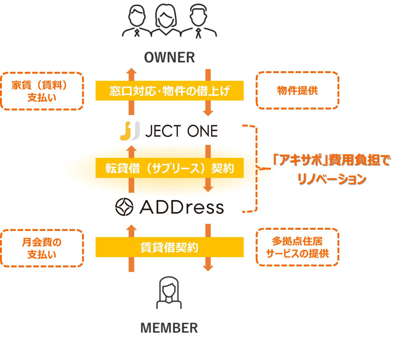 従来、ADDressへの物件登録の際は、物件オーナー様とADDress間で物件の転貸借(サブリース)契約を結ぶ形でしたが、今回の連携では、ジェクトワンが物件オーナー様との窓口対応および物件の借上げを行い、ジェクトワンとADDress間で転貸借契約を結びます。そして、「アキサポ」サービスにより、外壁、屋根、ファサードサッシ、内部解体、電気工事、給湯器交換等のリノベーション工事と家具・家電費用をジェクトワンが負担し、ADDressは内装工事とインテリアデザインを行います。