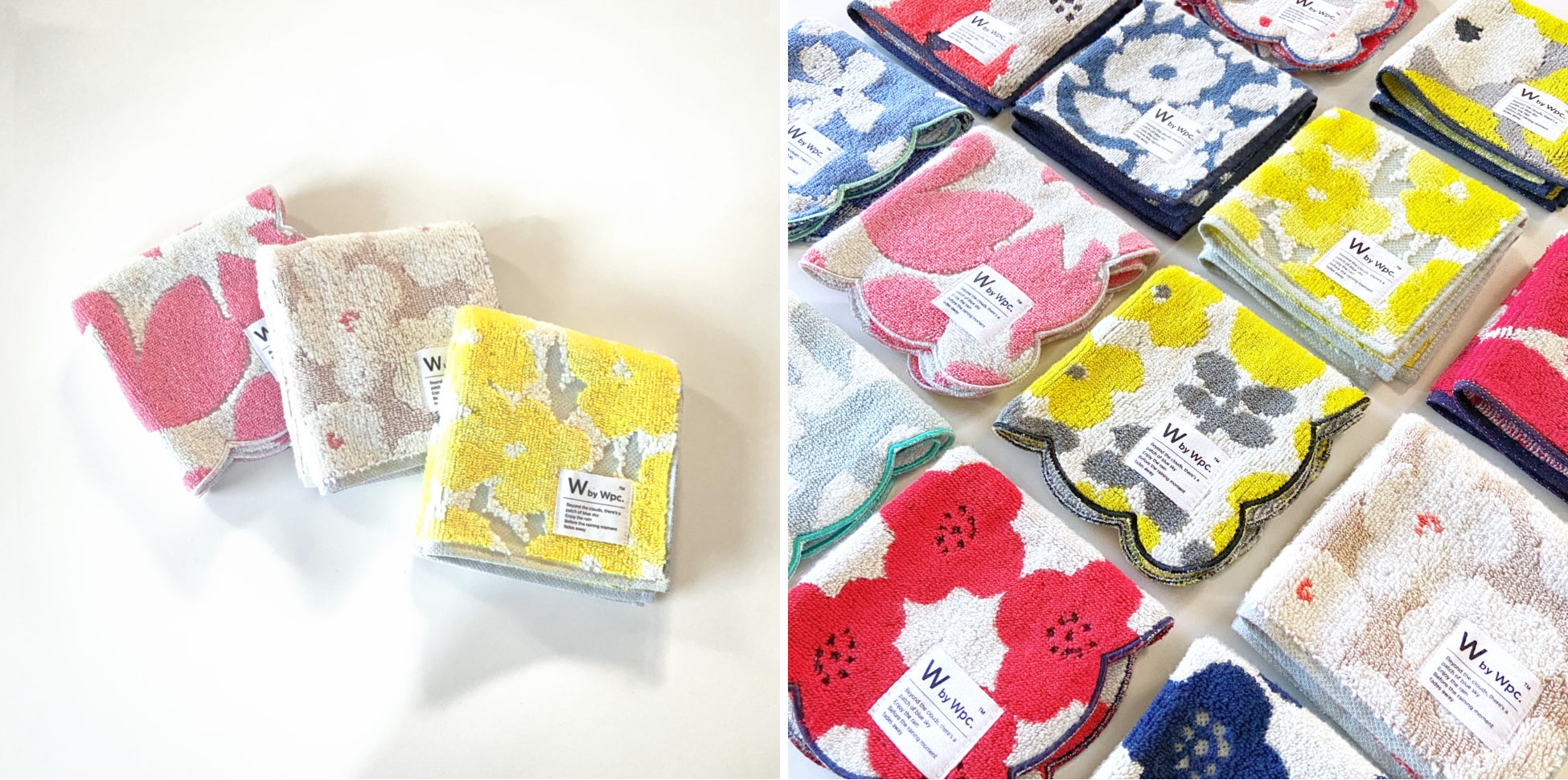 Wpc.の人気テキスタイルを使ったハンカチは今年新たに3柄が加わり、バリエーションも豊かになりました。無撚糸を使用しているためふわふわで手触りが良い部分もポイント。スタンダードタイプ、スカラップタイプ、パターンパイピングタイプの全19柄展開です。この他、ユニセックスデザインもご用意しております。