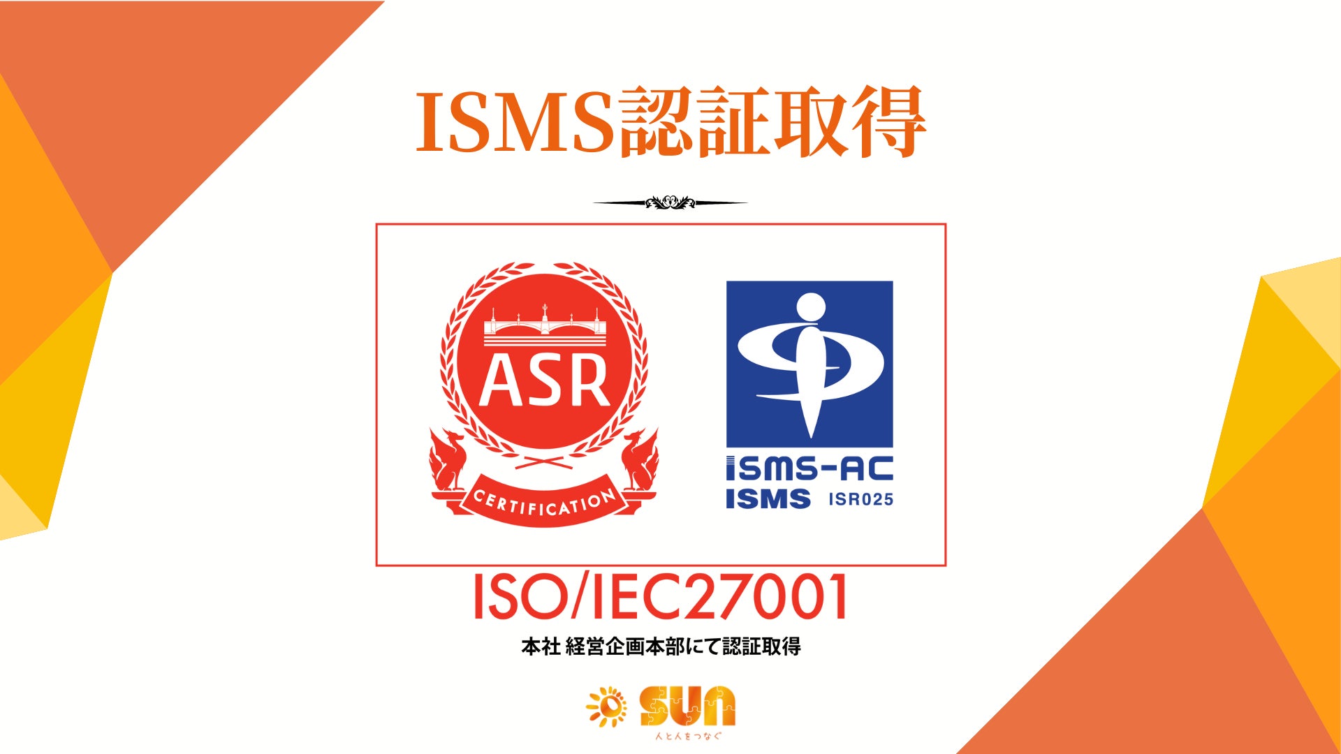 SUN株式会社(本社:東京都港区、代表取締役社長兼CEO:仲宗根俊平、以下 SUN)は、創業当時よりシステムインテグレーション事業を展開しています。この度、システムインテグレーション事業の受託・請負開発を担う経営企画本部(本社)において国際規格である情報セキュリティマネジメントシステム(ISMS/ISO 27001)の認証を取得しました。