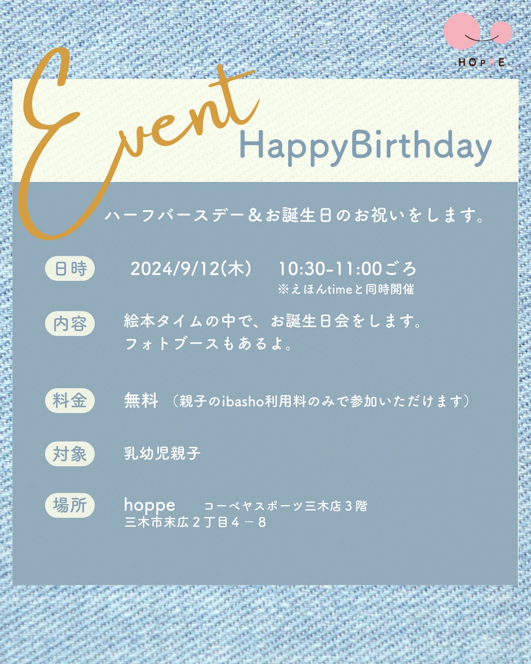 特定非営利活動法人ほっぺ(代表:大森 奈津子)は乳幼児親子向けイベントとして、2024年9月12日(木)にhoppe「親子のibasho」(コーベヤスポーツ三木本店3階)にて、『ハーフBirthday&お誕生日』を開催いたします。
