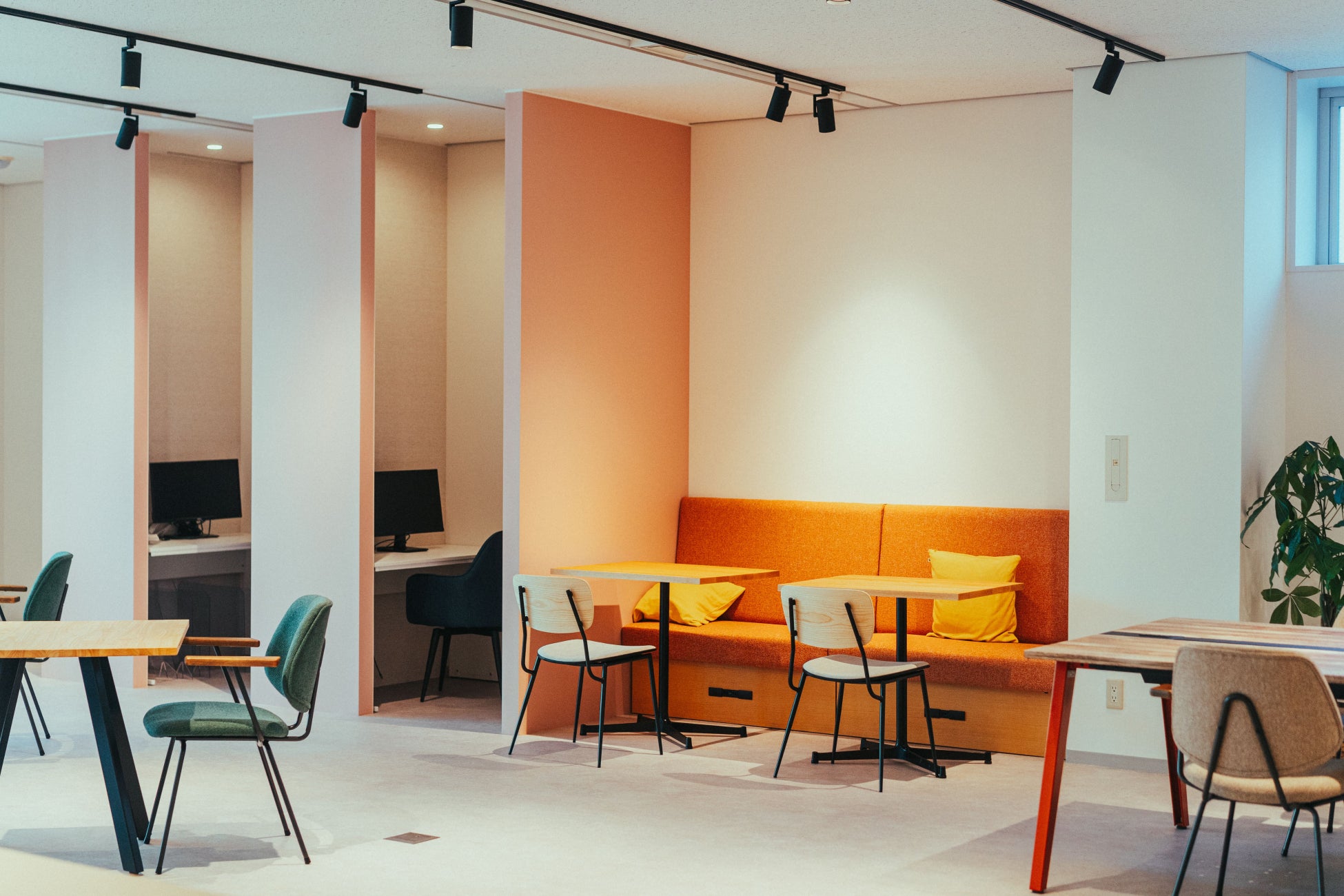 また、窓際には新宿のオフィス街を一望できるカウンターがあり、スタンディングスペースとしても利用可能です。温かみのあるオレンジ色のチェアとライトで落ち着いて働くことができます。