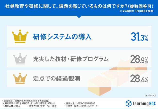 - 小売業界の研修担当者の約3割が「研修システムの導入」に課題を感じている