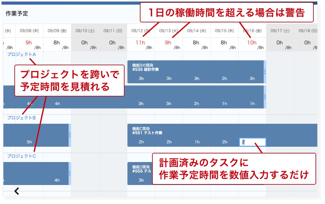 マネージャーから割り当てられたタスクに対して、作業者自身が作業時間を見積もることで、無理な計画を事前に察知し、早い段階での適切な計画見直しを可能にします。