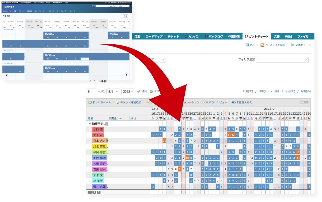 作業者自身の見積もりを、ガントチャートにもフィードバックします。工数見える化機能で厳しい計画を即座に感知できます。