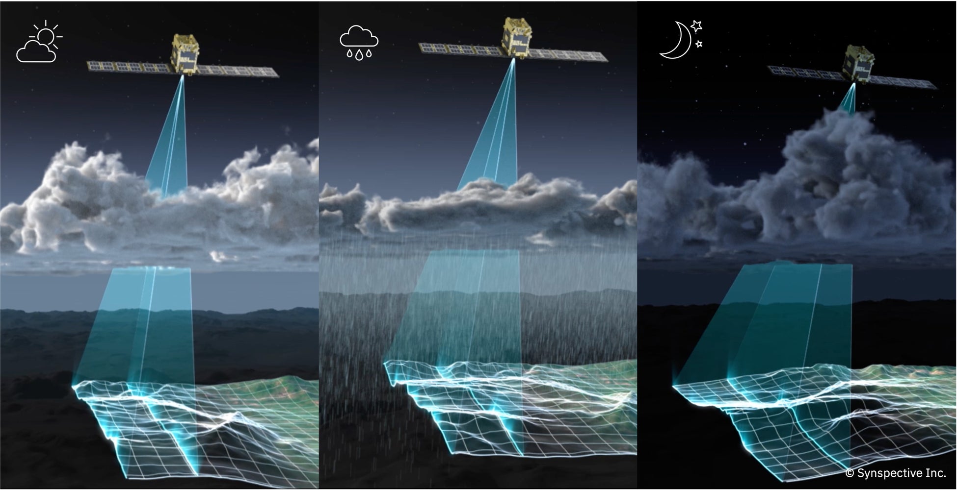 (*)SAR衛星とは:SARは、日本語では「合成開口レーダー」と言い、“Synthetic Aperture Radar”の略語で、SAR(サー)と呼びます。電波の一種であるマイクロ波を地球に向かって照射し、反射波を受信し、地表面の物性や形状などを観測します。この技術を搭載した衛星を”SAR衛星”と呼びます。SAR衛星の特徴は、自らが雲を透過する波長の電波を照射し、地上からの反射波を観測するため、天候や時間帯に依存せず、いつでもどんな時でもデータ取得が可能です。