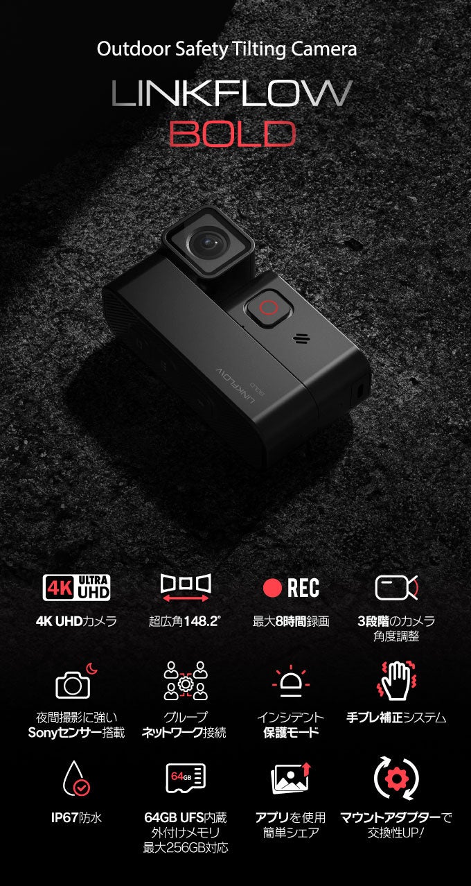 サイクル、バイク、車、アウトドアなど、様々なシーンで活躍する高性能カメラが日本に上陸しました。Kickstarterで話題を集めた「LINKFLOW BOLD」は、ライディングの安全を守る最先端カメラとして、多機能かつ高性能を備えています。