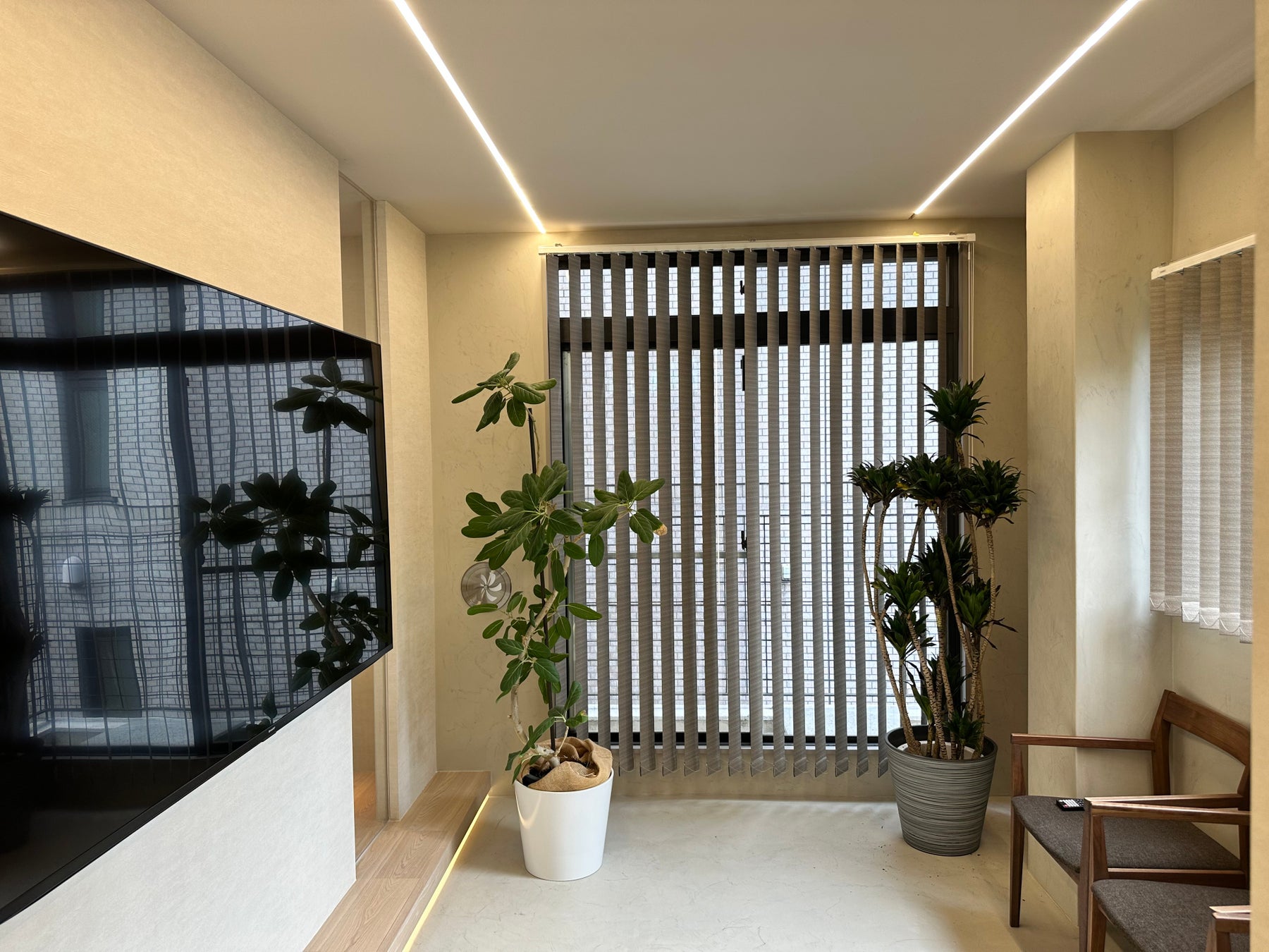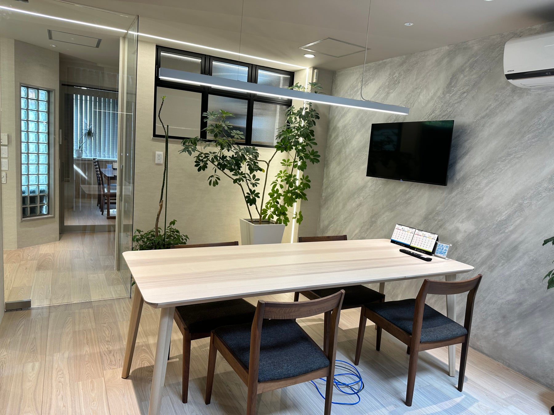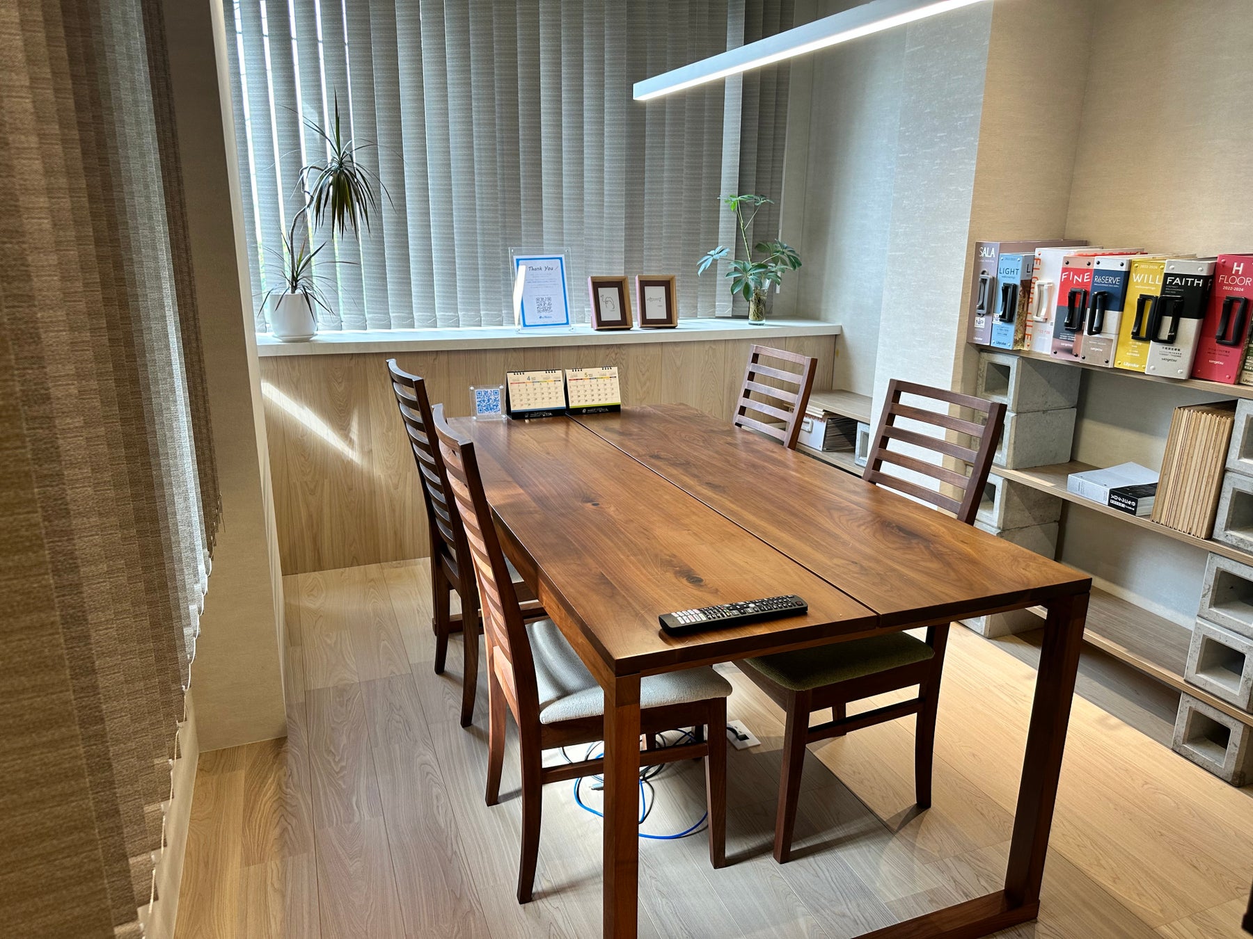 改装前はコンクリート床の店舗的なイメージでしたが、住空間としてもイメージできる内装にしました。インテリアテイストとしてジャパンディスタイル(日本と北欧を意味する「Japan」と「Scandinavia」を組み合わせた造語で、日本の和風スタイルと北欧風スタイルを融合させたインテリアスタイル)を採用。今後、注目を集めるインテリアスタイルを取り入れました。照明もライン照明を採用し、壁と床に沿ったシームレスなデザインとなっております。リラックスして話ができ、インテリアのイメージが膨らむ打合せスペースへと改装しました。