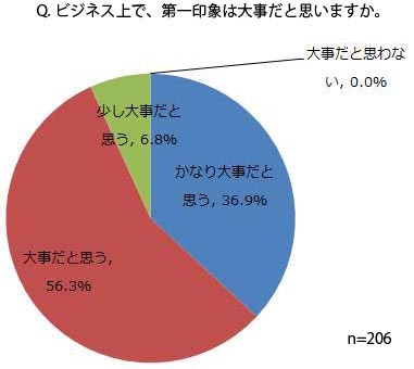 「THE SUIT COMPANY」が「30歳代~50歳代の社会人」206名を対象に行った『ビジネスにおける社会人の第一印象に関するアンケート調査(2014年2月13日発表:http://www.uktsc.com/tsc/news/detail/72)』で、「ビジネス上で、第一印象は大事だと思いますか?」という質問をした所、「大事だと思う※」と回答された方が100%という結果になり、あらためてビジネスにおける第一印象は大事だという事が分かりました。
