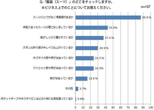 また、「初対面では、相手のどこをチェックしますか?」という質問に対して「服装(スーツ)」と回答された方に、服装(スーツ)のどこをチェックするのかを聞いてみた所、「スーツにシワがなく清潔感があるか」(86.9%)、「体型に合ったスーツの着こなしをしているか」(43.0%)がチェックされる項目の上位となりました。