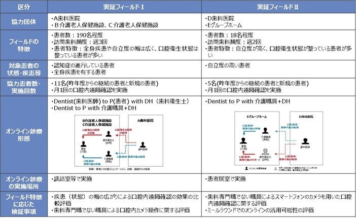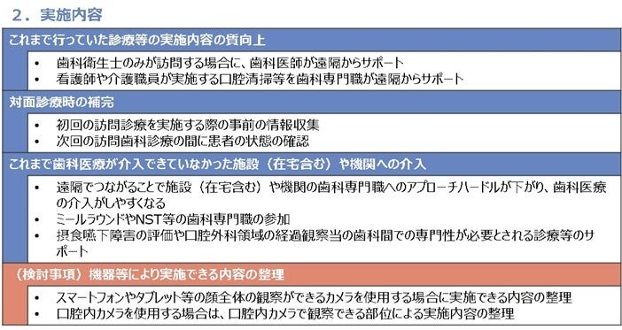 上記の背景を踏まえ、歯科標榜のない病院や介護施設と地域の歯科医療機関をオンライン診療や情報通信機器を用いて連携することで、効果的・効率的な歯科専門職の介入方法および適切な運用・活用方法などを検討し、医科歯科連携を含む多職種連携のありかたについて検証することを目的に、4社で協働し実施しました。