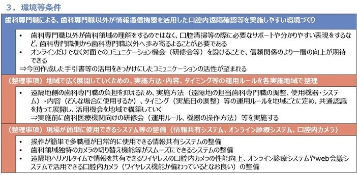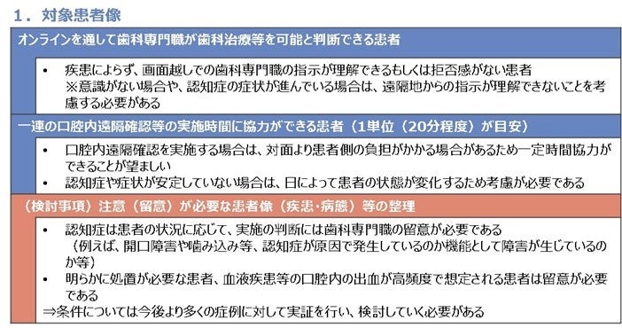 情報通信機器を活用して口腔内を遠隔で確認などする場合に確認ができた事項と、今後検討が必要な事項を「対象患者像」「実施内容」「環境等条件」の観点にて取りまとめました。また、情報通信機器を活用した診療などの実運用に向けて今後検討・検証が必要な事項についても取りまとめています。