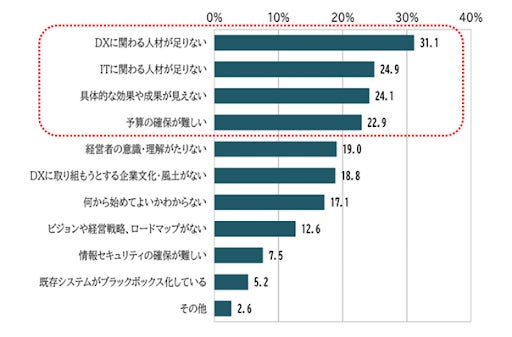独立行政法人中小企業基盤整備機構の調査によると、2022年5月時点での「中小企業でのDX推進に関するアンケート」を実施した結果、「DXやITに関わる人材不足」「具体的成果が見えない」「予算の確保が難しい」などがDX推進に向けた課題の上位に上がりました。
