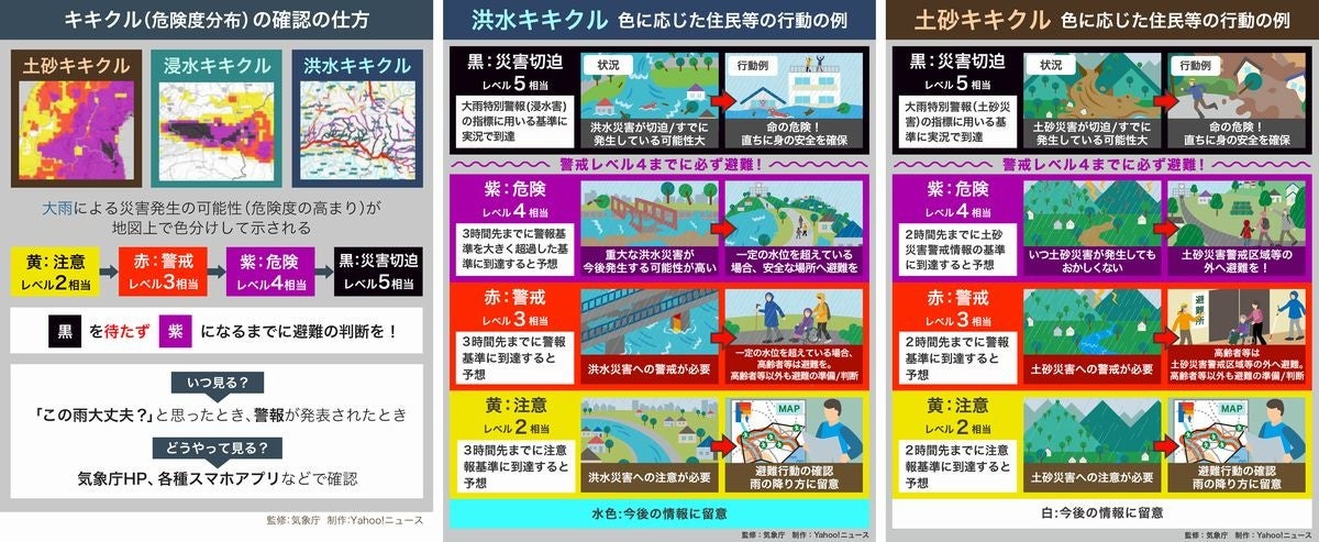 ヤフー株式会社(以下、Yahoo! JAPAN)が運営する日本最大級のインターネットニュース配信サービス「Yahoo!ニュース」は本日、防災知識をわかりやすく伝え、一人でも多くのユーザーが命を守る知識を身につけられることを目的として、気象庁と連携してインフォグラフィック(※1)による防災情報などの普及啓発の取り組み(以下、本取り組み)を開始しました。また本日、本取り組みの第一弾として、大雨や土砂災害などの災害に対する危険度を地図上で確認できる「キキクル」などについてのインフォグラフィックを公開し、「Yahoo!ニュース」にも掲載しています。