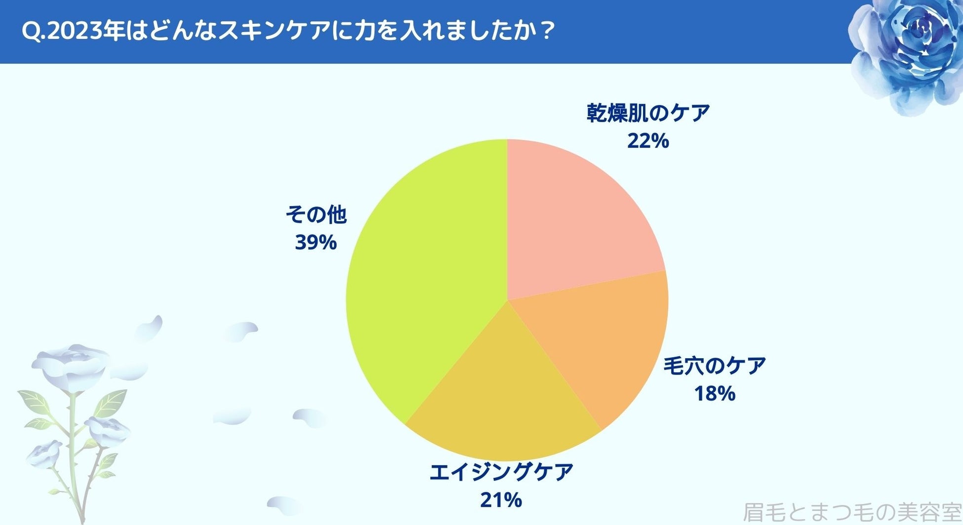 2023年にどのようなスキンケアに力を入れたかお聞きしたところ「乾燥肌のケア(22%)」、「毛穴のケア(18%)」、「エイジングケア(21%)」、「その他(39%)」という結果になりました。