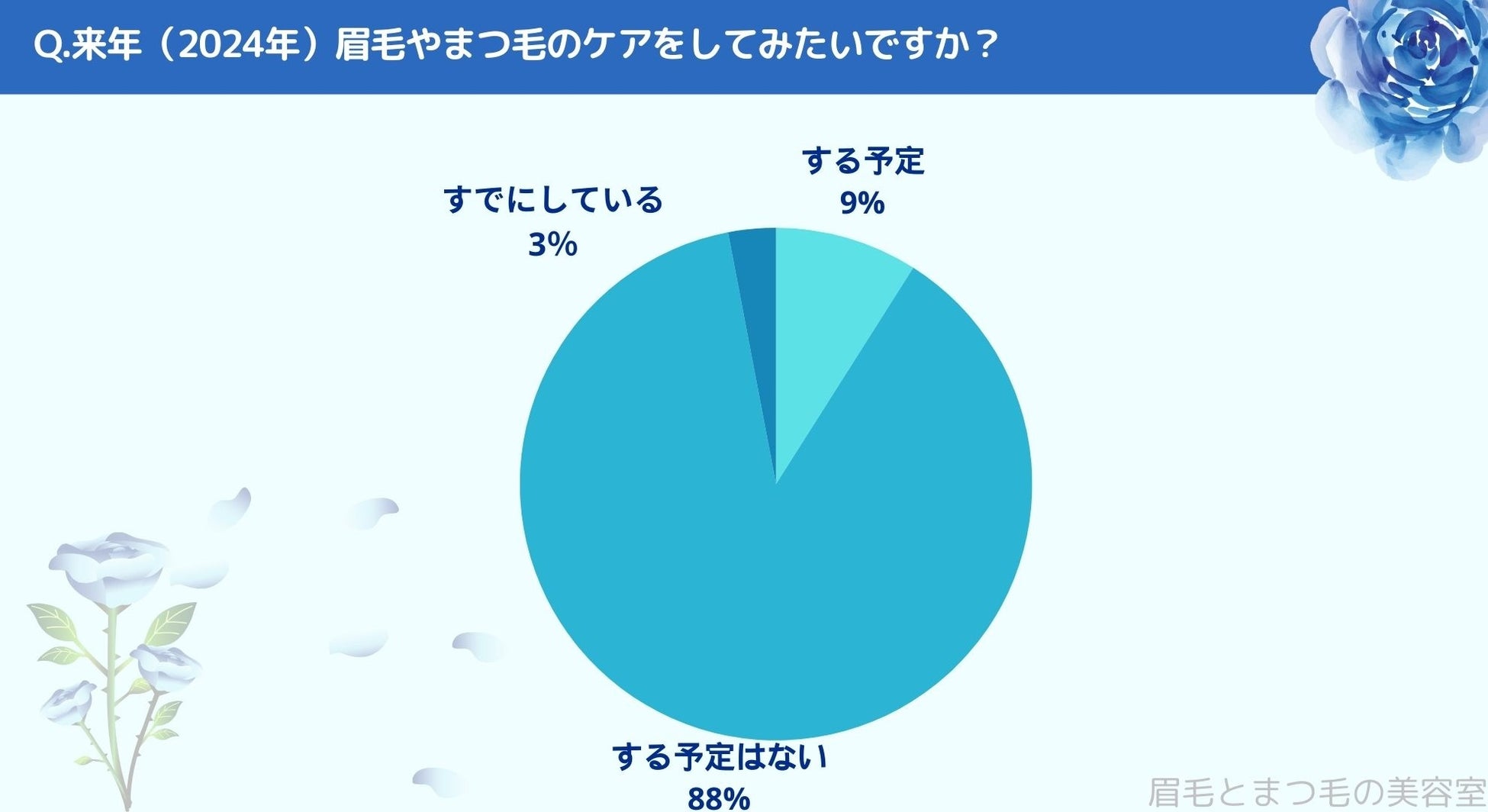 来年、眉毛・まつ毛のケアをしてみたいかお聞きしたところ「する予定(9%)」、「する予定はない(88%)」、「すでにしている(3%)」という結果になりました。