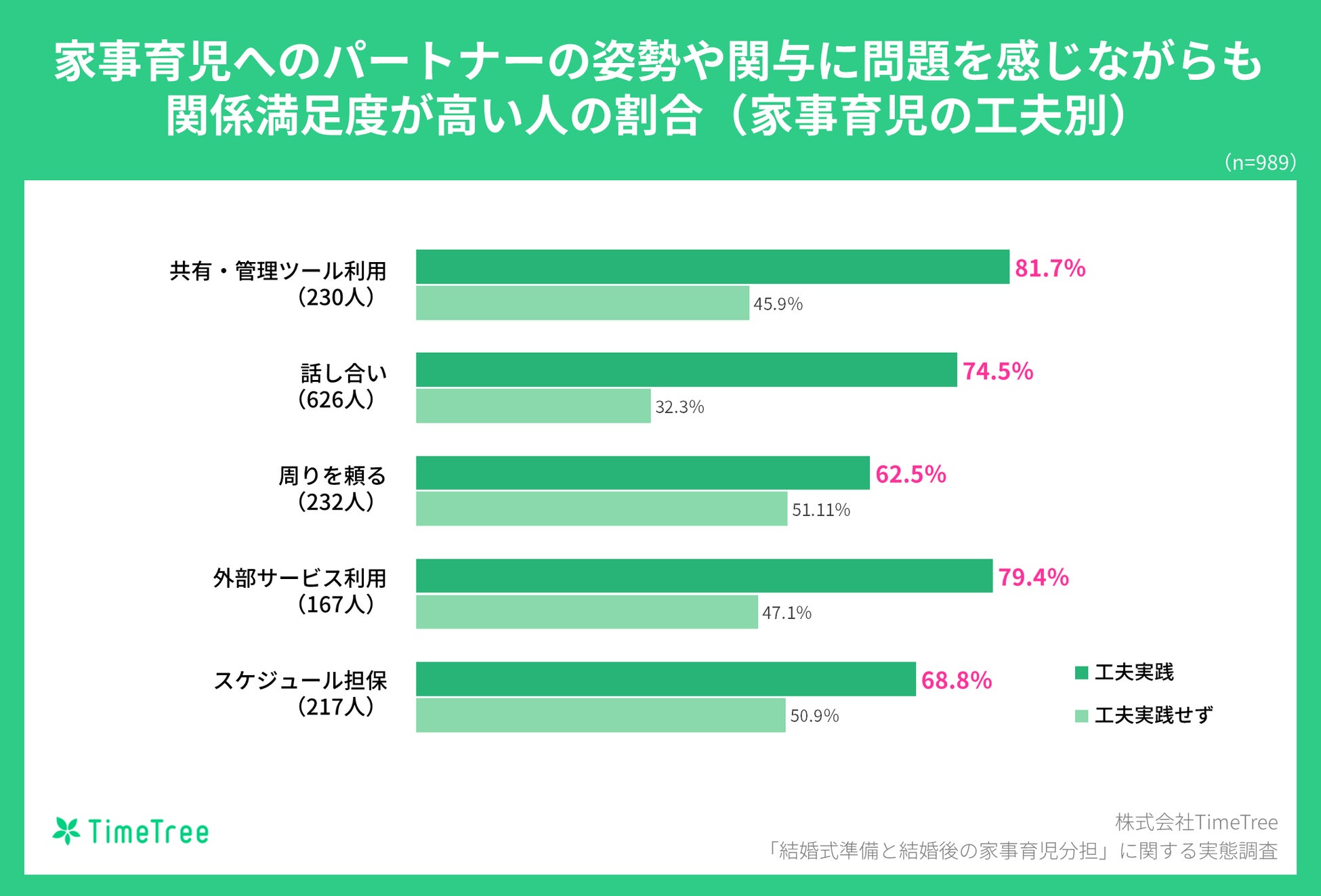 家事育児に対するパートナーの姿勢や関与に対して問題を感じても、家事育児の中で何らかの工夫を取り入れている場合は、その工夫を行わない人に比べて「パートナーとの関係満足度」が高くなる傾向がありました。