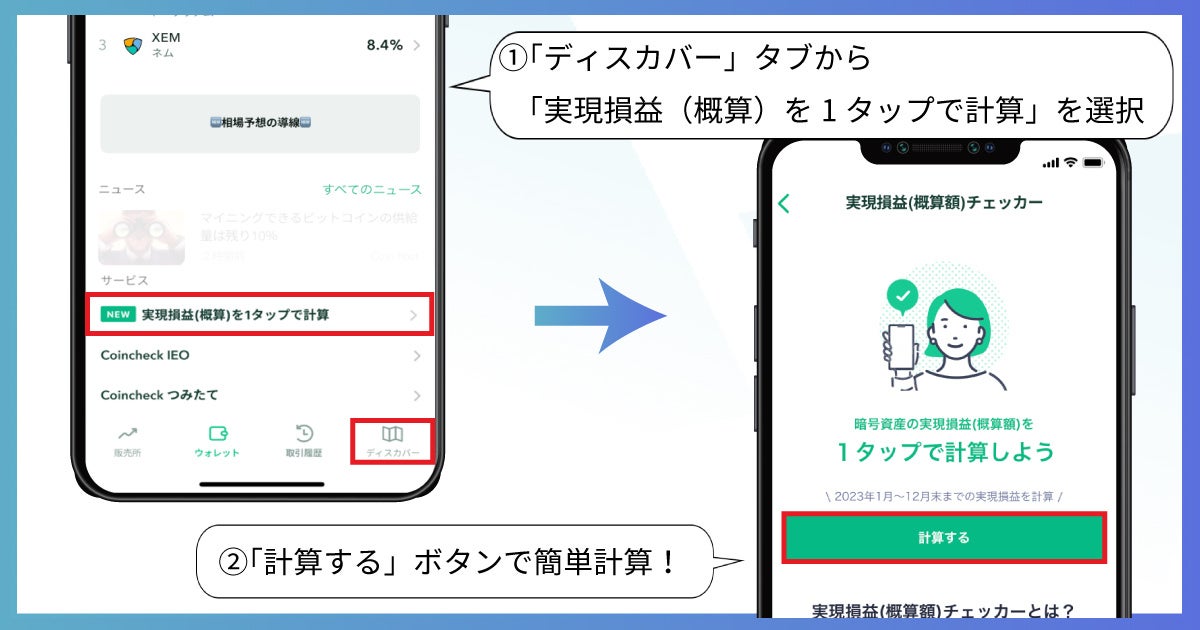 対象バージョンの「Coincheckアプリ」を起動し、ログインした状態で「ディスカバー」タブ内の「実現損益(概算)を1タップで計算」メニューを選択。「実現損益(概算)チェッカー」画面の「計算する」ボタンからご利用いただくことが可能です。