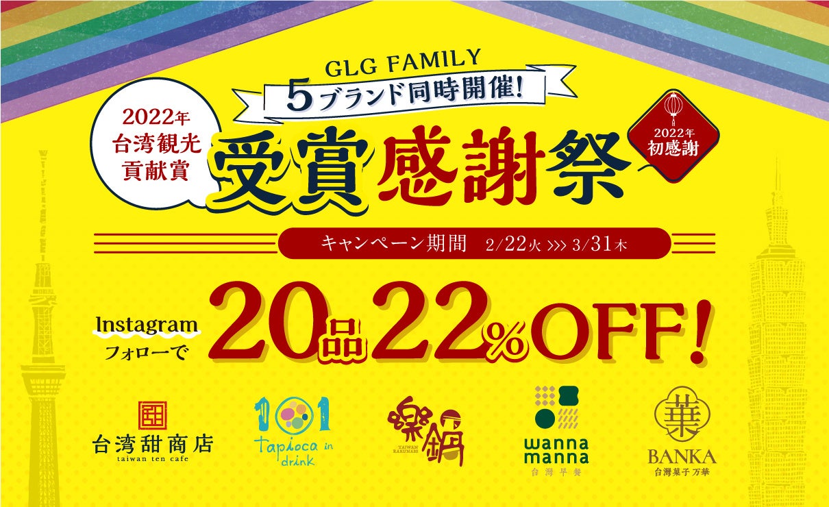 始まりは2008年、GLG FAMILYの代表、管 卓明はタピオカ原材料の輸入会社を福岡に立ち上げたあと、2012年に、今も愛され続ける「101タピオカドリンク」を創業。その後、台湾と日本の架け橋を目指し、複数のブランドを生み出しました。そして、よりディープな台湾食文化を日本の皆様にお届けしたいと考え、2017年には台湾美食とスイーツ専門店「台湾甜商店」をオープン。2021年はさらに新たなブランド、大阪・南森町に台湾朝食専門店「wanna manna」、台湾菓子専門店「万華」をオープンさせるなど、2020年春から海外渡航が厳しいなか、今までと変わらず台湾の魅力を日本の皆様へお届けし続けた事が台湾観光促進への貢献として評価され、この度受賞に至りました。