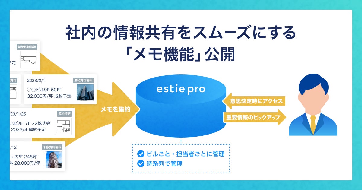 株式会社estie(本社:東京都港区、代表取締役CEO:平井瑛、以下「estie」)は、日本最大級の商業用不動産データ分析基盤「estie pro」において、導入企業の物件担当者が日々収集しているオフィスビルに関わるあらゆる情報を社内共通のデータとして蓄積・共有を実現する「メモ機能」を新たに搭載しました。