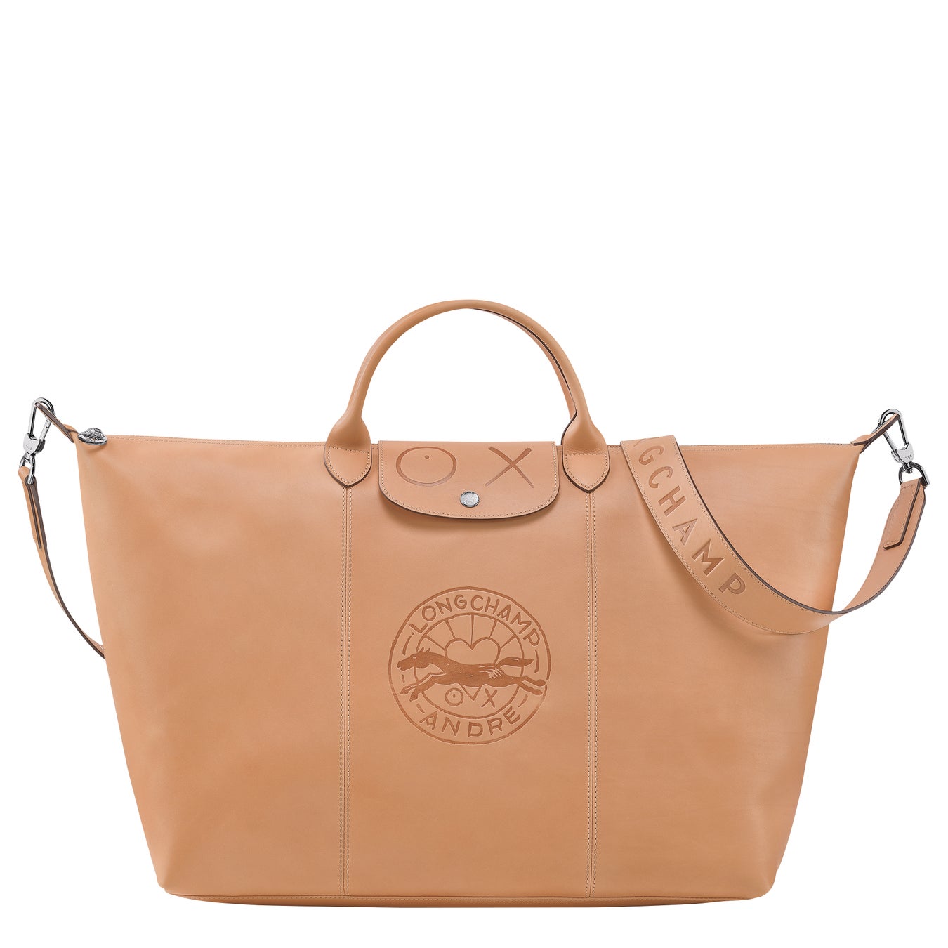またアンドレのこだわりとして、本コラボコレクションでは世界を飛び回っている彼自身も愛用できるレザー製トラベルバッグもクリエイトしました。メゾンが彼のためにセレクトした、時間とともに美しいパティナを帯びるカーフレザーのバッグには、アンドレがアレンジを加えた “ロンシャン・ホース”のメダイヨンが輝きます。ソフィは『「ル プリアージュ®」のファスナーに付いている円い金具、アンドレの描く“Mr. A”の円いフォルム - アンドレがデザインした円いメダイヨンは、メゾンとのコラボレーションを巧みに象徴しています』、アンドレも『たとえ目を閉じていてもパーフェクトな円を描くことができるよ』と微笑んで語っています。