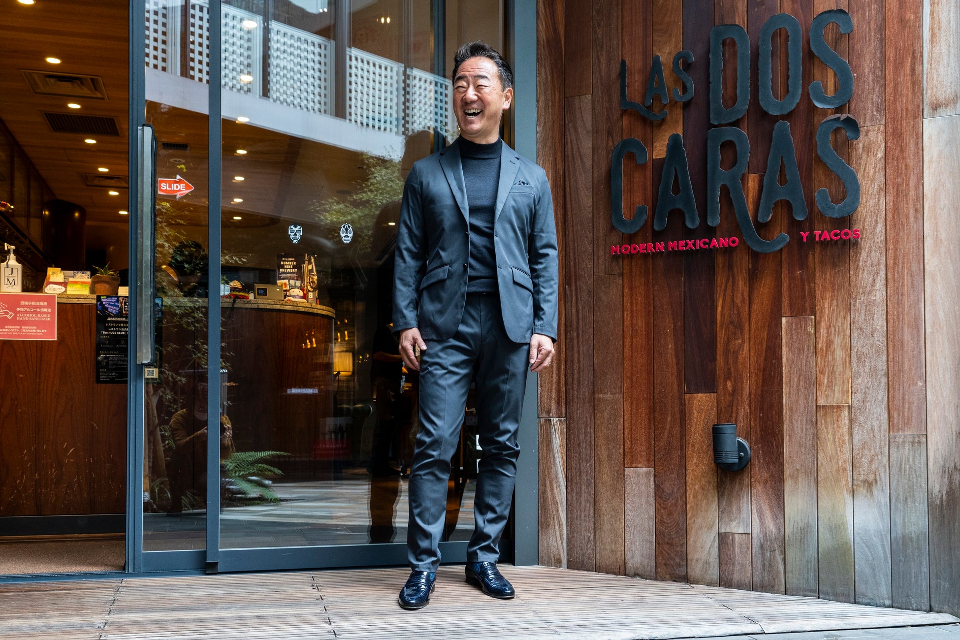 「ありそうでなかった着眼点で作られたスーツ。2年間毎日洗濯できて、ノーアイロンでOK!」とその機能性とスタイリッシュさに惚れ込んだ社長の新川自身も、Bizモデルの新色・ビターチャコールを好みのワントーンコーディネート、小物で大人の遊びをプラスして、その着心地の良さを楽しんでおります。