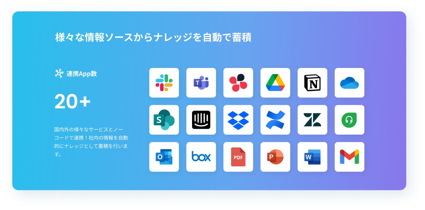 Slackなどのチャットツール内での会話情報、PDFなどのドキュメント、Notion内の記事など、様々なデータソースから社内の情報を自動的に集約します。