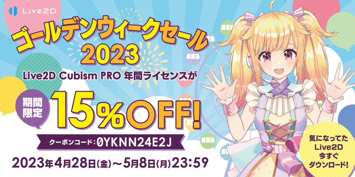 2023年4月28日(金)~2023年5月8日(月)の11日間限定で『Live2D Cubism PRO ライセンス』が15%OFFでご購入頂けるクーポンを配布します!
