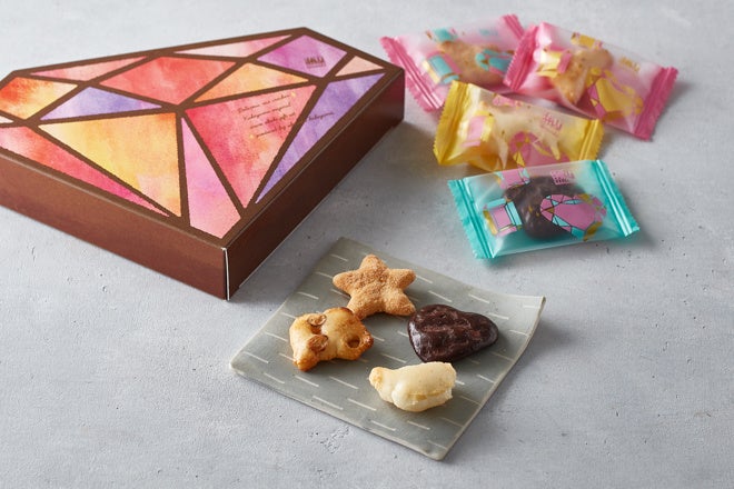 おかき専門店「赤坂柿山」の4種のおかきをピンクのダイヤ型ボックスに詰め合わせたバレンタイン限定セット。チョコレートやキャラメル、 チーズ味など、甘辛両方楽しめる洋風のセットは、ご友人へのプチ ギフトにぴったり。甘いものが苦手な方にもおすすめです。