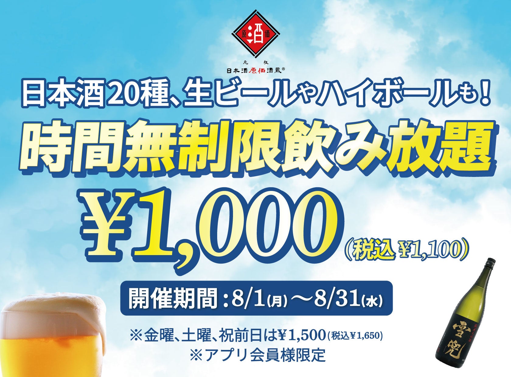 8月1日(月)~8月31日(水)に日本酒原価酒蔵全店にて時間無制限飲み放題¥1,000(税込¥1,100)~を開催します。